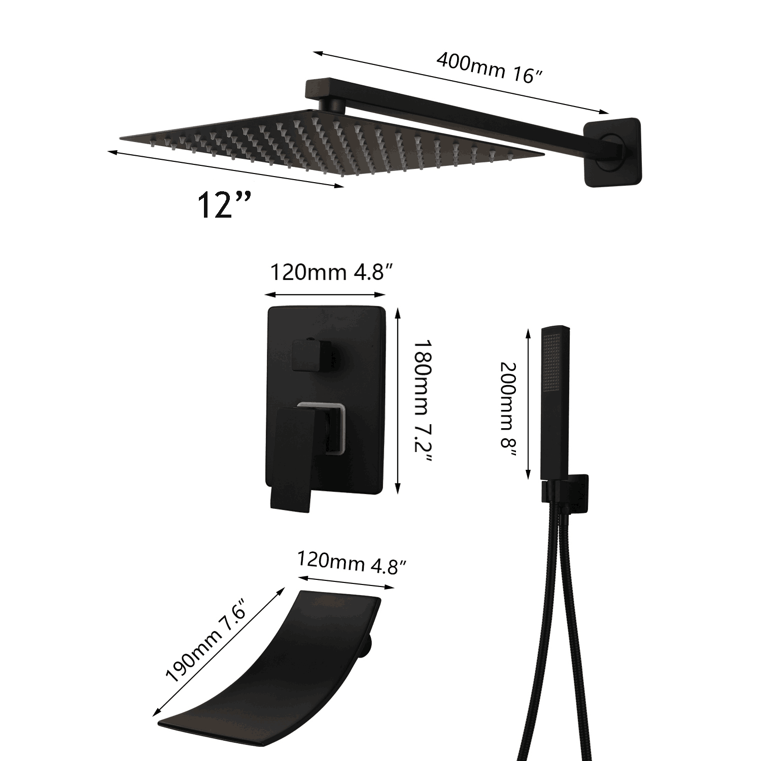 12" Black Bathroom Shower Faucet Set Square Shower Head Tub Mixer Wall Mount Tap