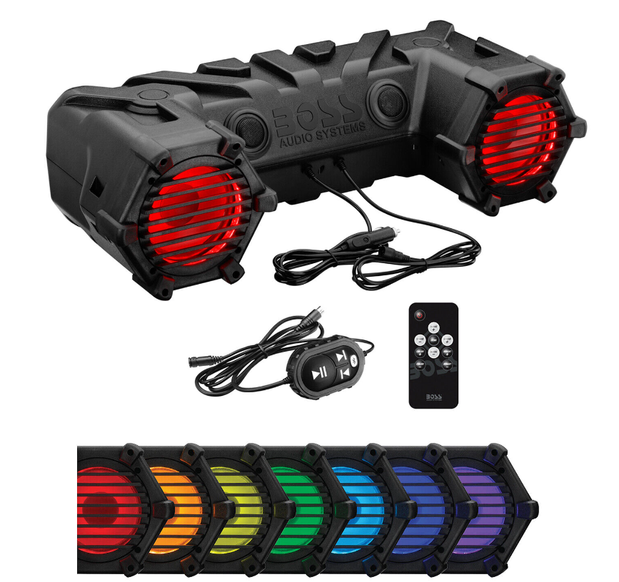 Take your music on the trails, tailgating or camping with the BOSS Audio Systems ATV30BRGB weatherproof powersports plug and play system.