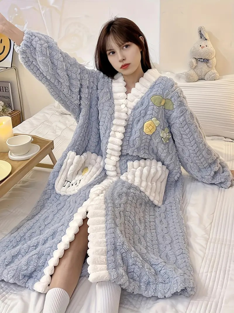 Flower Decor Fuzzy Night Robe, Cute Long Sleeve V Neck Robe With Pockets, Women's Sleepwear