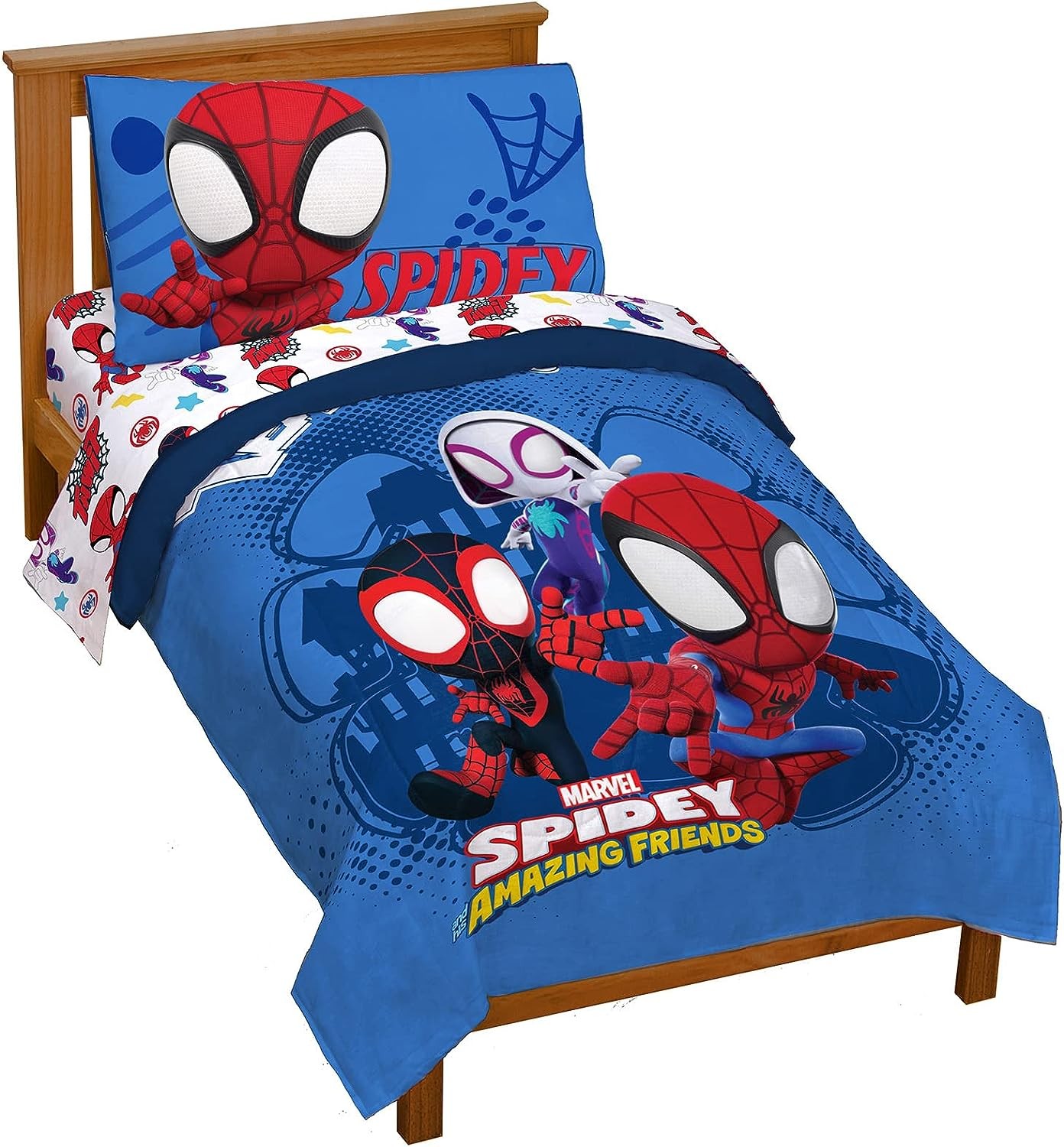 Jay Franco Marvel Spidey and His Amazing Friends Team Spidey 4 Piece Toddler Size Bed Set – Super Soft Microfiber - Includes Comforter & Sheet Set Bedding (Official Marvel Product)