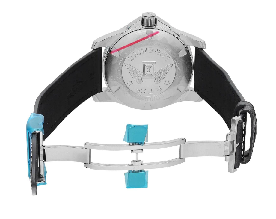 Stainless steel case with a black leather band. Fixed stainless steel bezel. Black dial with luminous silver-tone hands and index hour markers. Arabic numerals mark the 6 and 12 o'clock positions. Minute markers around the outer rim. Dial Type: Analog. Luminescent hands and markers. Date display at the 3 o'clock position. Longines calibre L619/888 automatic movement, based upon ETA 2892, containing 21 Jewels, bitting at 25200 vph, and has a power reserve of approximately 64 hours. Scratch resistant sapphire crystal. Screw down crown. Solid case back. Round case shape. Case size: 41 mm. Case thickness: 11.5 mm. Band width: 21 mm. Fold over clasp with a push button release. Water resistant at 300 meters / 1000 feet. Functions: date, hour, minute, second. Conquest Series. Dive watch style. Watch label: Swiss Made. Longines Conquest Black Dial Automatic Men's Watch L3.777.4.58.0.