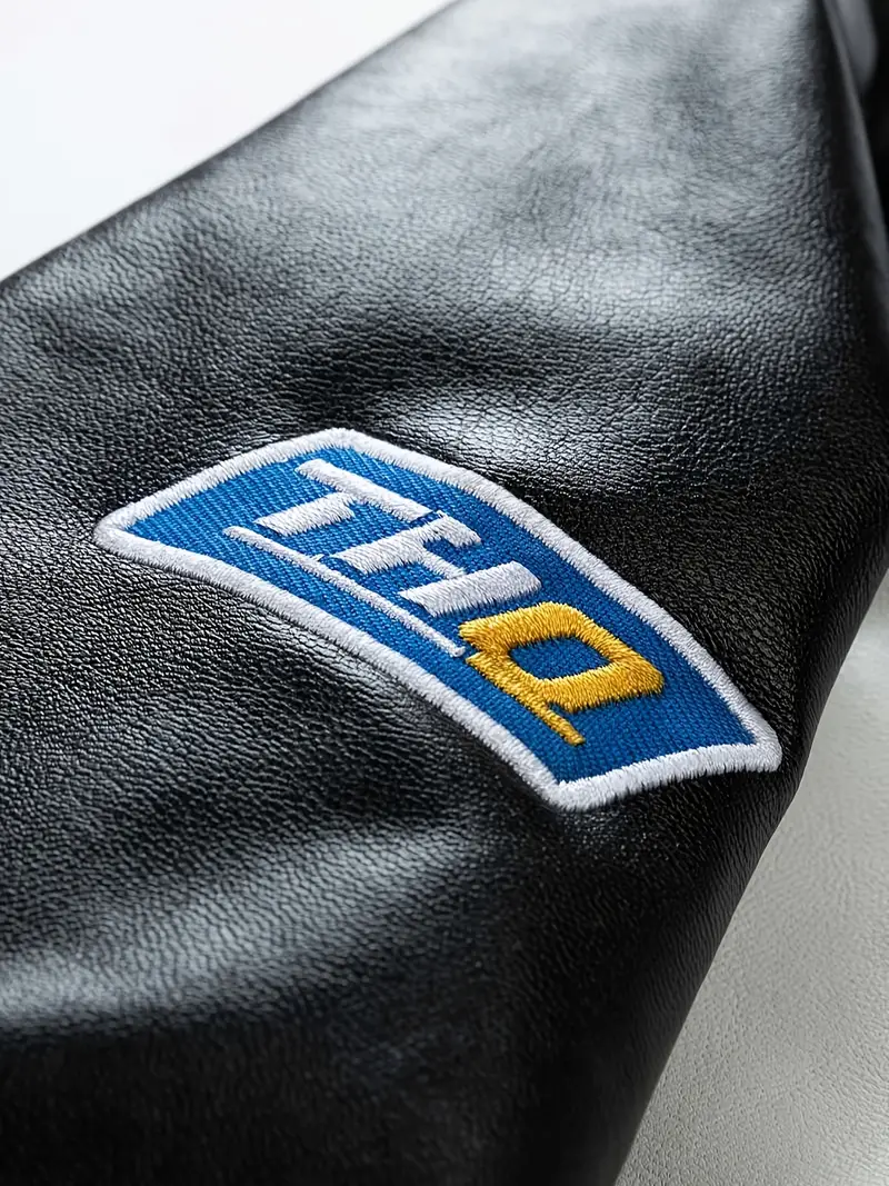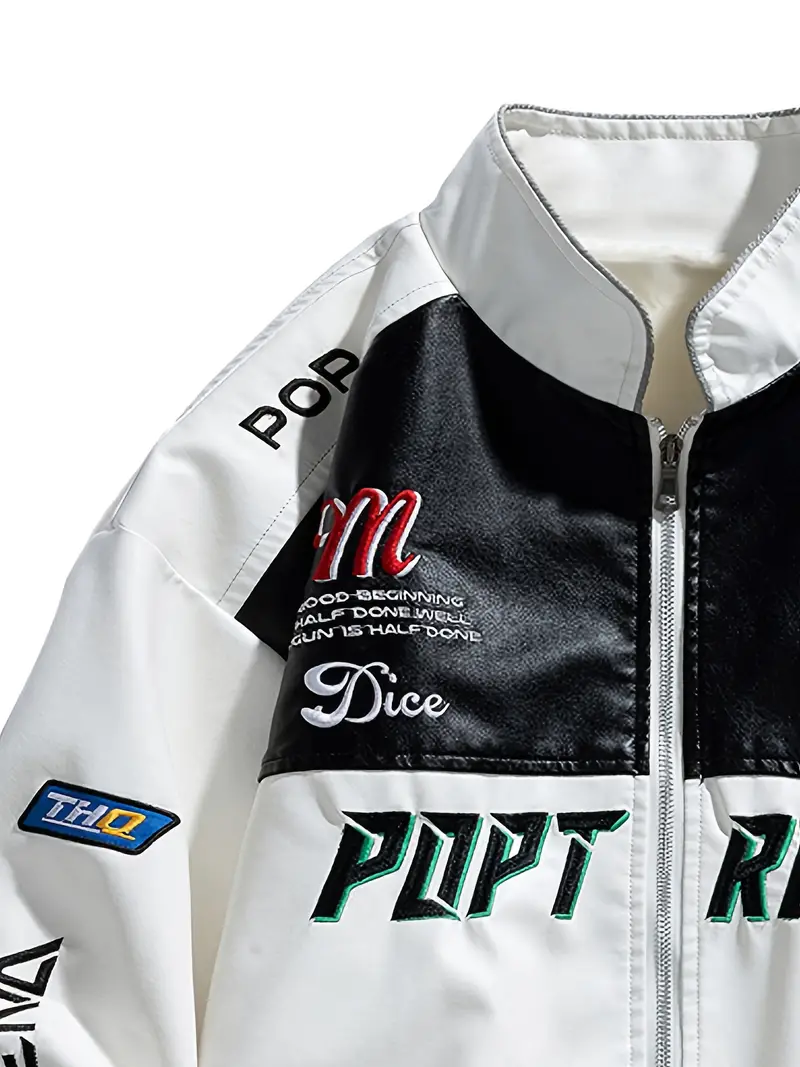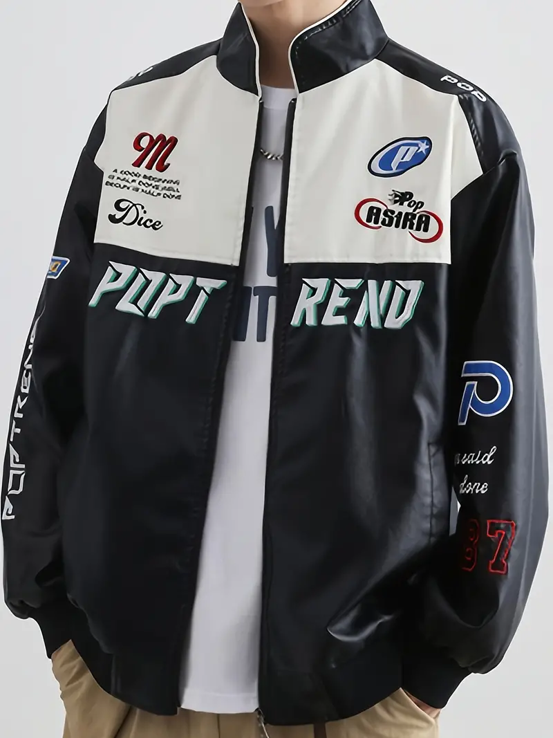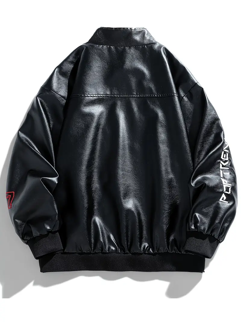 Men's Stylish PU Leather Letters Pattern Jacket With Pockets, Casual Breathable Stand Collar Zip Up Long Sleeve Jacket For Outdoor Activities