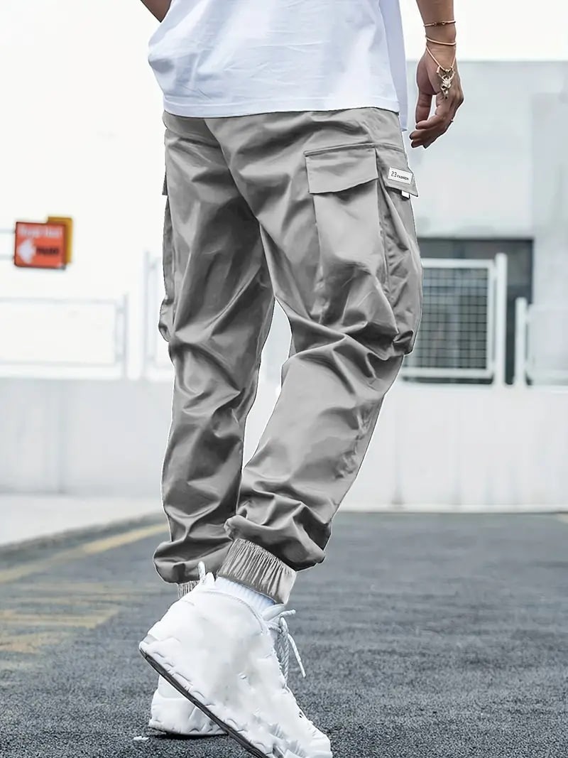 Plus Size Men's Drawstring Cargo Pants: Letters Print, Multi-Pocket Design, Perfect For Outdoor Activities