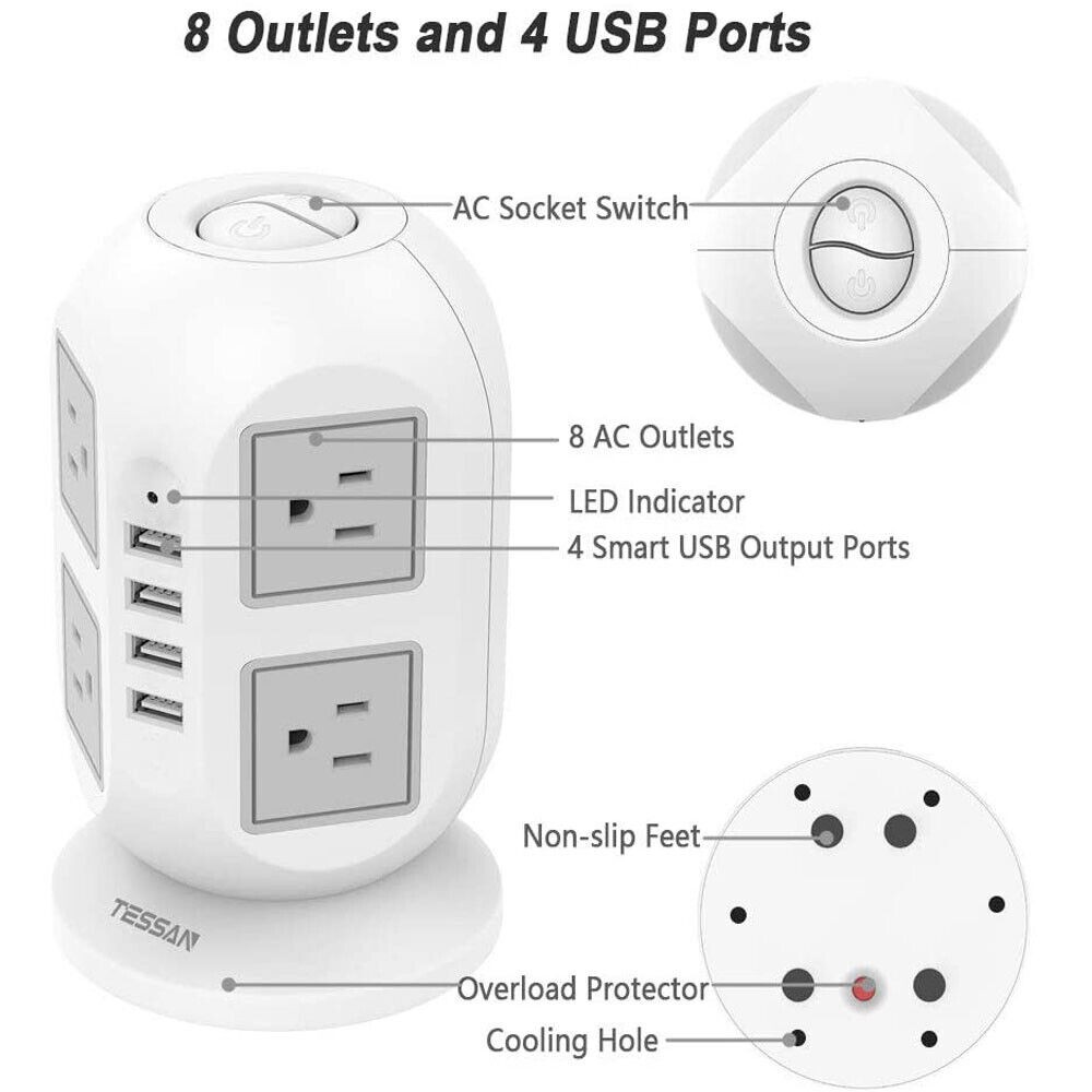 Power Strip Tower Surge Protector with 8 Outlet 4 USB 6/10/15 FT Extension Cord